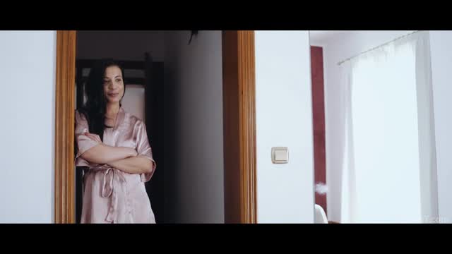 Unexpected sex visitor joins masturbating brunette through a window
