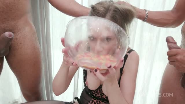 First Piss! 5on1 first time slut Dina Joy gets a portion of piss along with a double vagina from five big cocks